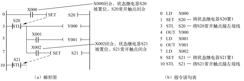 当X000常开触点闭合时→[ SET S20 ]指令执行→状态继电器S20被置1(置位)→S20常开触点闭合→Y000线圈得电;若X001常开触点闭合,Y001线圈也得电;若X002常开触点闭合,[ SET S21 ]指令执行,状态继电器S21被置1→S21常开触点闭合。