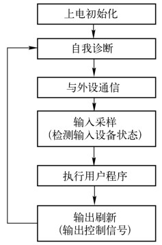 PLC通电后,首先进行系统初始化,将内部电路恢复到起始状态,然后进行自我诊断,检测内部电路是否正常,以确保系统能正常运行,诊断结束后对通信接口进行扫描,若接有外设则与其通信。通信接口无外设或通信完成后,系统开始进行输入采样,检测输入设备(开关、按钮等)的状态,然后根据输入采样结果依次执行用户程序,程序运行结束后对输出进行刷新,即输出程序运行时产生的控制信号。以上过程完成后,系统又返回,重新开始自我诊断,以后不断重复上述过程。