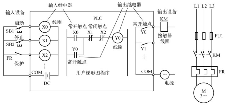 图2-5中PLC内部等效图中的X0、X1、X2称为输入继电器,它由线圈和触点两部分组成,由于线圈与触点都是等效而来,故又称为软线圈和软触点,Y0称为输出继电器,它也包括线圈和触点。PLC内部中间部分为用户程序(梯形图程序),程序形式与继电器控制电路相似,两端相当于电源线,中间为触点和线圈。