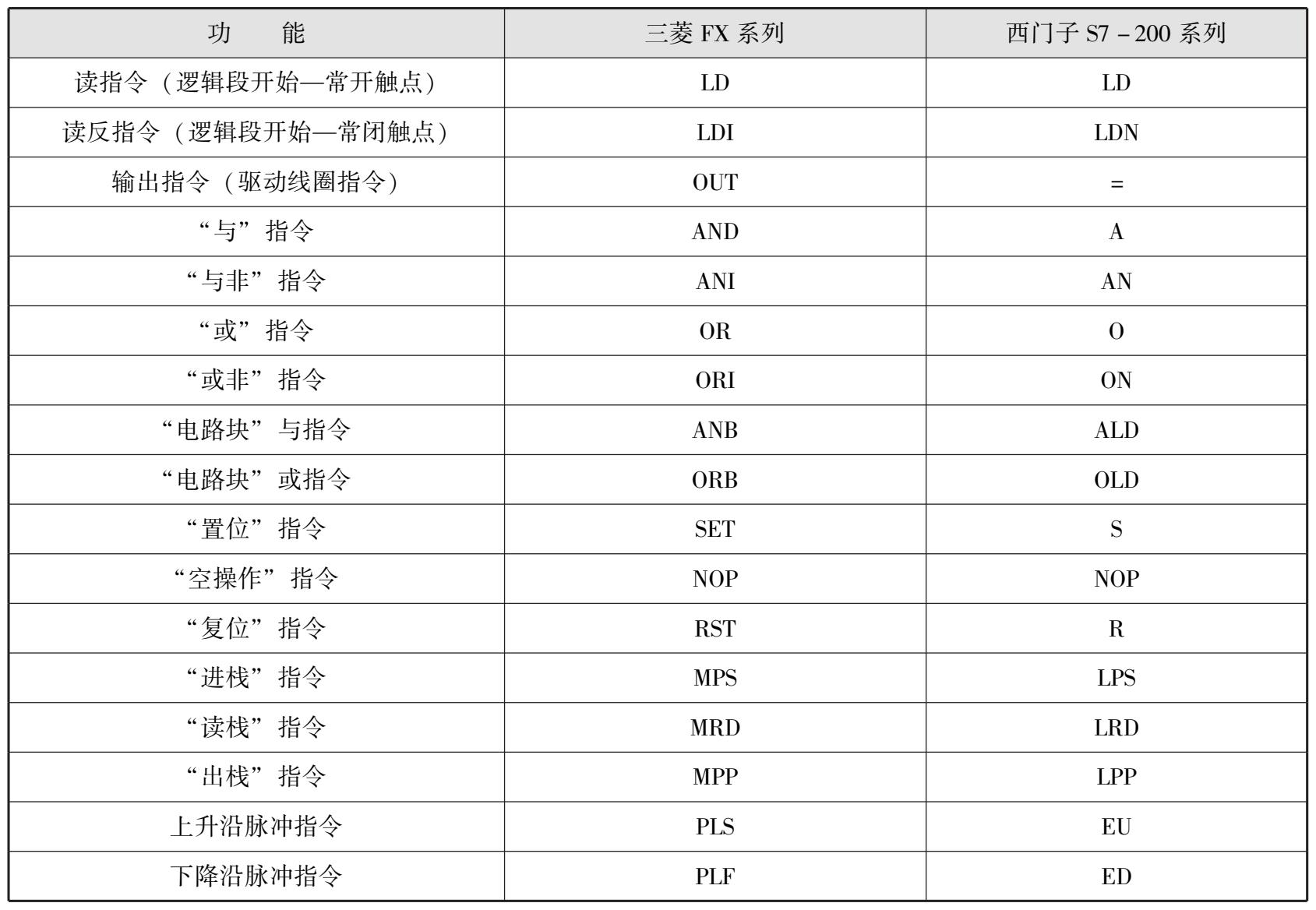 不同品牌或同品牌不同型号的PLC中,其相应编程指令的功能和特性基本相同,但每种PLC中所采用的指令标识符均不相同。三菱FX系列PLC、西门子S7-200 系列PLC中最常用、最基本的逻辑指令对照表见表 3-2。