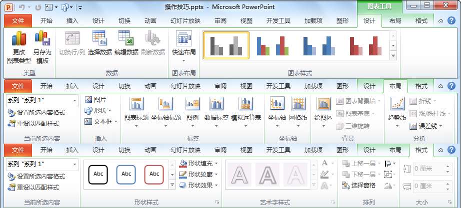 选中刚刚插入的柱形图,在菜单上出现了一个“图表工具”新选项卡,选项卡又分为“设计”、“布局”和“格式”三个子选项卡,如图3-11所示,所有选项尽收眼底。