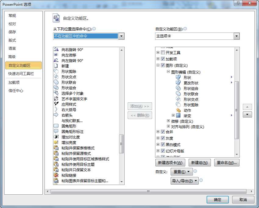 3 在对话框左侧,找到“形状剪除”、“形状交点”、“形状联合”和“形状组合”四个命令,并将其“添加”到“图形编辑”组中。用同样的方法,还可以把其他常用的命令放到这个新建的选项卡里。