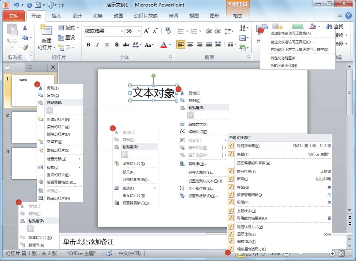 图3-7 PowerPoint 2010窗口各个位置的右键菜单