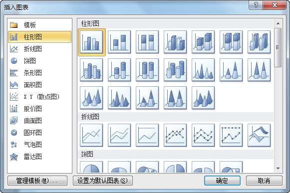 2 在弹出的窗口中,可以看到所有的图表都分门别类地列了出来,找到想要的的柱形图,选择并单击“确定”按钮,如图3-9所示。