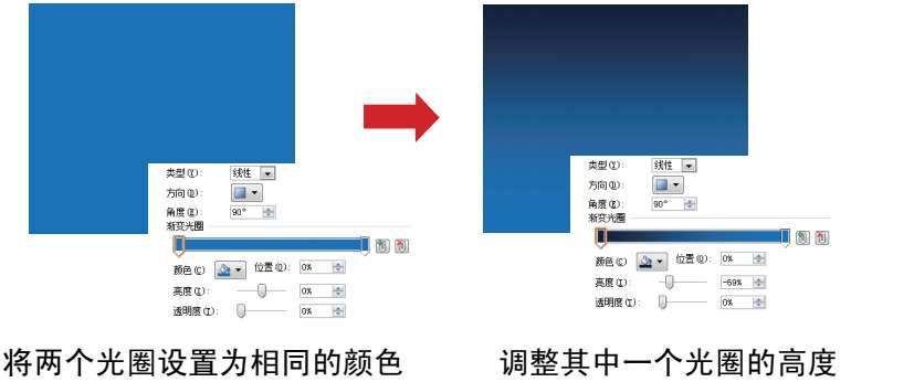 同种颜色的亮度渐变是PPT中很常用的一种渐变,比如天空就是从一个比较深的蓝色渐变为一个比较浅的蓝色。这种渐变的设置方法是:首先设置两个渐变光圈,为这两个光圈设置完全相同的两种颜色,然后选择其中一个光圈,调整亮度,如图3-27所示。