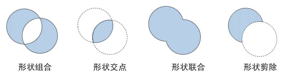 观察图3-14中的4、5、6号图形,可以发现这三个图形可以看做是由两个简单的形状拼合而成的,绘制这样的图形,需要用到“形状组合”、“形状联合”、“形状交点”和“形状剪除”四个图形运算命令。在3.1节,我们已经将这四个工具放到了新建的自定义菜单中,通过图标就可以知道这四个命令的作用,如图3-19所示。