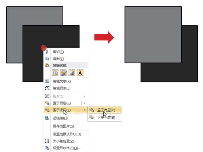 单击“开始”选项卡右侧绘图区的“排列”按钮,在其下拉菜单中可以看到“置于顶层”、“置于底层”、“上移一层”和“下移一层”这四个层次排列命令。选中对象右击也可以调出这四个命令。