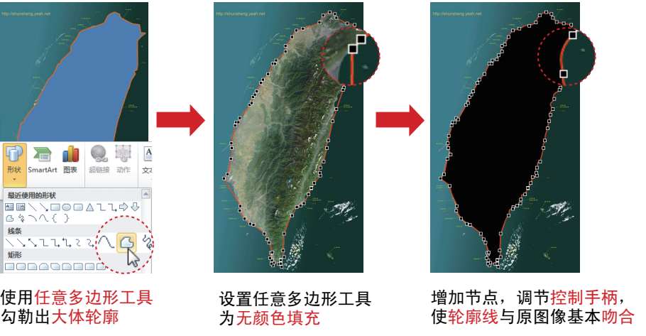 3 为方便后面的微调,将任意多边形填充为无色。使用PowerPoint窗口右下角的页面缩放工具放大页面,仔细调整线条曲线的顶点,使之与图片的轮廓基本切合。最后将调整好的任意多边形填充为想要的颜色。
