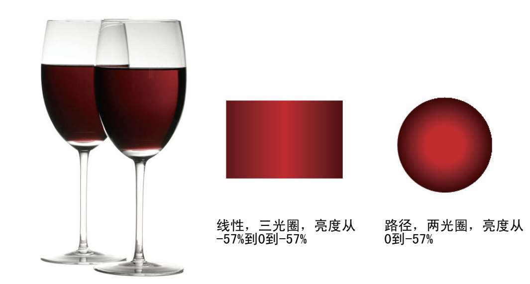 装着红葡萄酒的玻璃杯给人的感觉是“通透”的,透明又富有变化,是非常漂亮的光线效果。在PPT中,这种效果可以通过同色亮度线性渐变(暗亮-暗,矩形)或者亮度路径/射线渐变(亮-暗,圆形)来简单实现,如图3-59和图3-60所示。