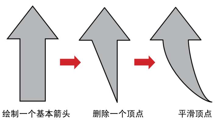 首先使用“箭头”工具画一个简单的箭头,然后编辑箭头顶点,最后调节顶点至形状平滑,如图3-45所示。