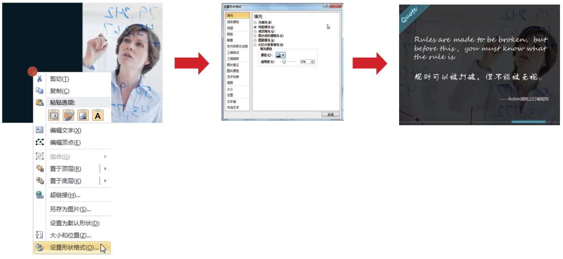 右击自定义图形,选择“设置形状格式”,在弹出的“设置形状格式”的“填充”对话框底部,即可设置透明的纯色填充,如图3-23所示。这是最简单的透明填充,但非常有用。