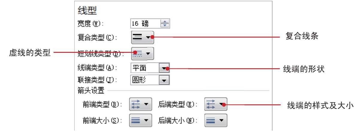 在“设置形状格式”的“线型”中,可以对线条的形状进行调整,在“设置形状格式”的“线条颜色”中,可以设置线条的透明及渐变,如图3-34所示。