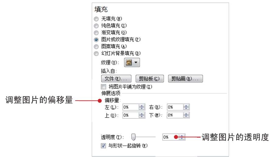 在没有勾选“将图片平铺为纹理”时,如图3-29所示,填充的图片会自适应自定义图形的尺寸而产生压缩变形,因此常常需要改变图片的偏移量。