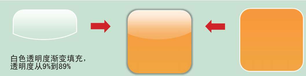 与普通的渐变填充相比,反光的渐变效果更强烈,立体感也更强,制作关键是在色块上面添加一个或多个具有透明度从0到100%的白色渐变填充图形。按照色块的形状,这种渐变图形通常是以下两种形式之一:一是透明度为0到100%的白色射线渐变填充的圆形,二是透明度为0到100%的白色线性渐变填充的矩形(或圆角矩形),如图3-51所示。