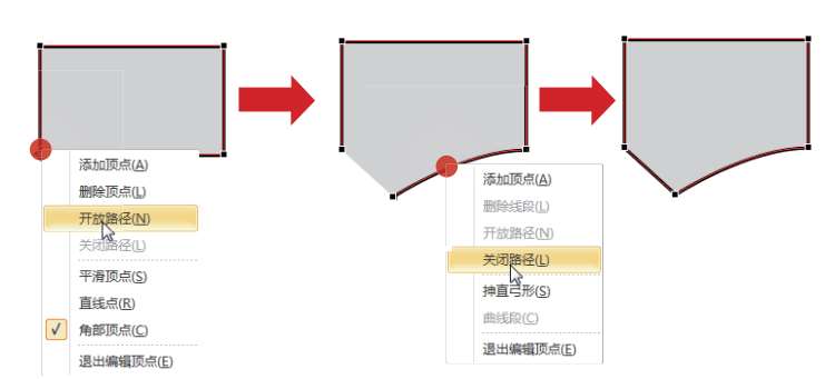 “开放路径”选项可以将轮廓线切断,但一条封闭的路径线只能开放一次,也就是说无法将自定义图形的轮廓线分成两段,“关闭路径”则可以将已经开放的路径线重新合上,如图3-18所示。
