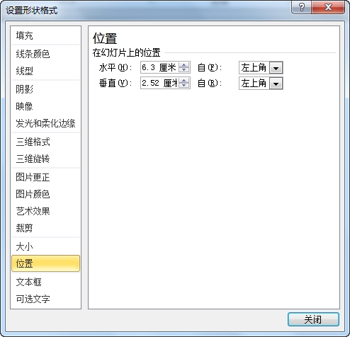 这时可以取消“对象与网格对齐”,或者使用Ctrl键和上、下、左、右四个方向键来对对象进行位置的微调。如果对位置的精度要求很高,则可以通过“设置形状格式”对话框的“位置”命令精确调节,如图3-40所示。