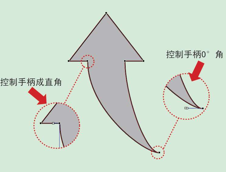 1 连接箭头头部与根部的两个顶点,各自的两个控制手柄要成直角。这样箭头头部看起来才是“正”的,如图3-46所示。
