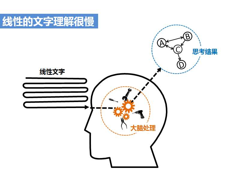 1 文字是语言的符号,人类对语言的处理几乎全部依靠左脑,因此仅靠文字传达信息无论在效率和效果上都不会很好,因为文字需要逐字阅读,所以其信息的传递是线性的,如图4-1所示,仅通过文字建立对整体的理解总是很慢的。