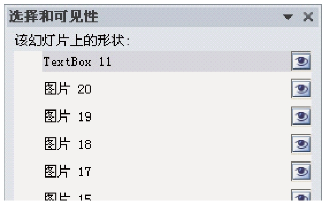 要制作复杂的动画,难免层层叠加。只有把不需要的对象隐藏起来,我们才能化繁为简,给对象随意添加动画。在选择窗格里,每个对象后面都有一个“眼睛”图标,单击这个图标,我们就可以让对象随时出现或隐藏,也方便对下面的对象进行动画操作。