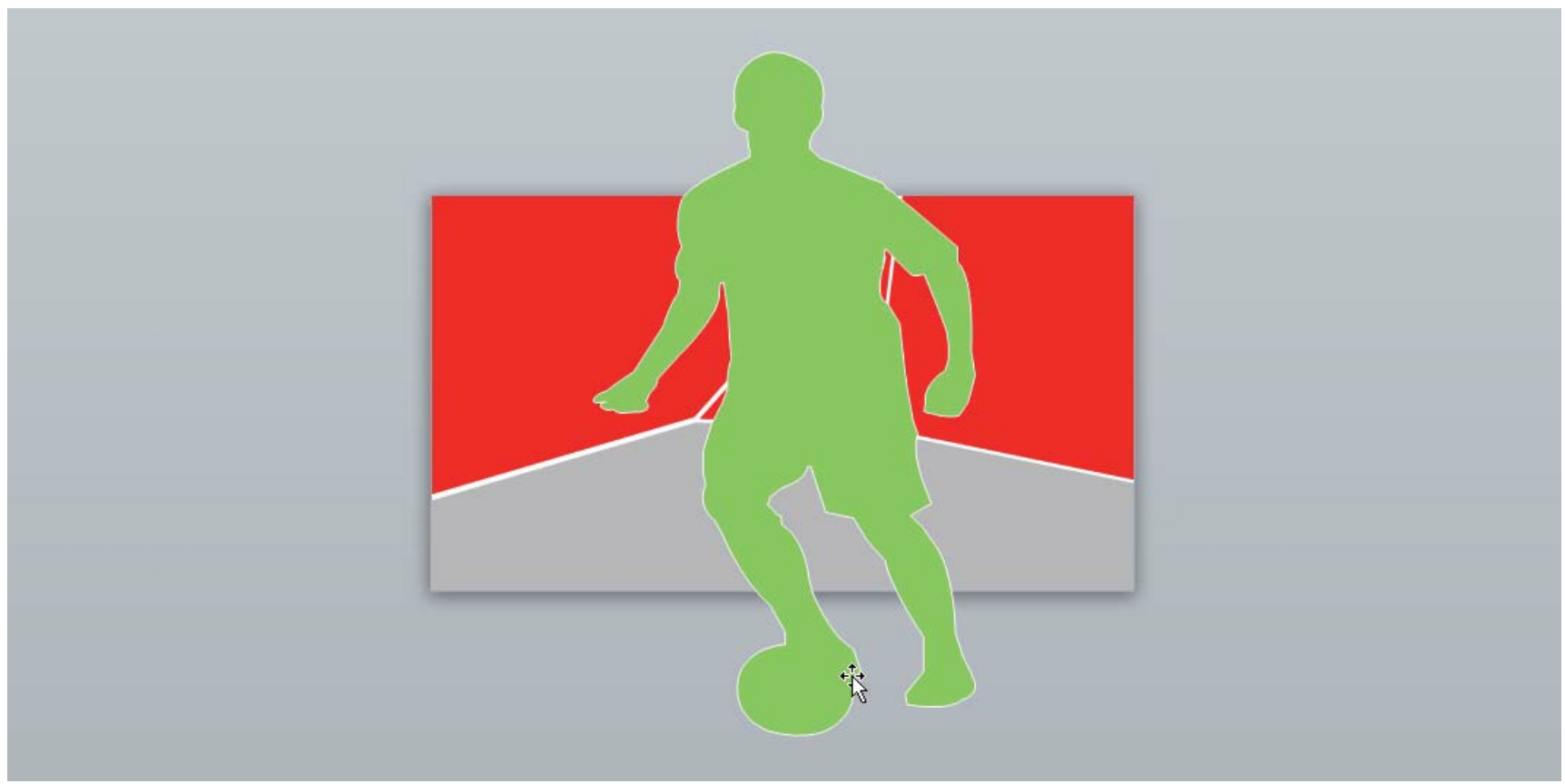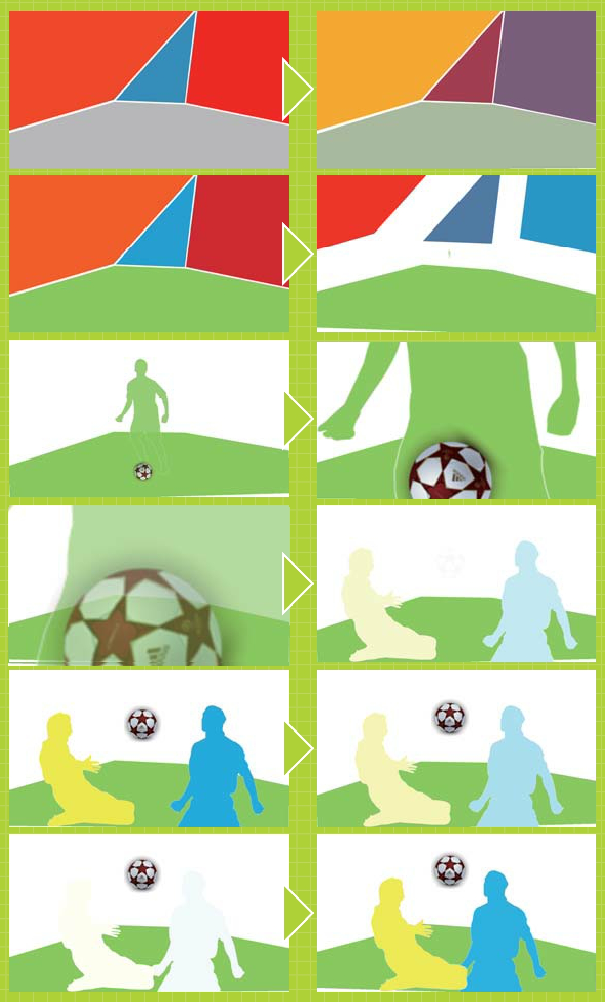 例2-5为2010年南非世界杯宣传PPT的片段。动画的创作思路是:南非国旗演变成绿茵赛场,一名球员带球由远而近,两名队员从两个方向冲向足球,看着足球在空中飞起。
