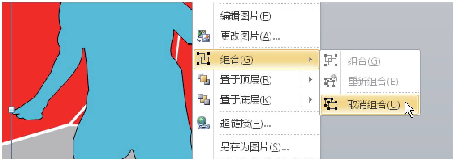 其三,右键单击图片任何位置,选择“组合/取消组合”命令,强制解散。图片变成了图形!
