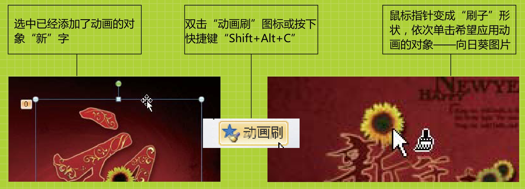 为简单起见,我们只需要为“新”字和向日葵添加缩放动画就行了。采用动画刷,只需要三步即可完成。