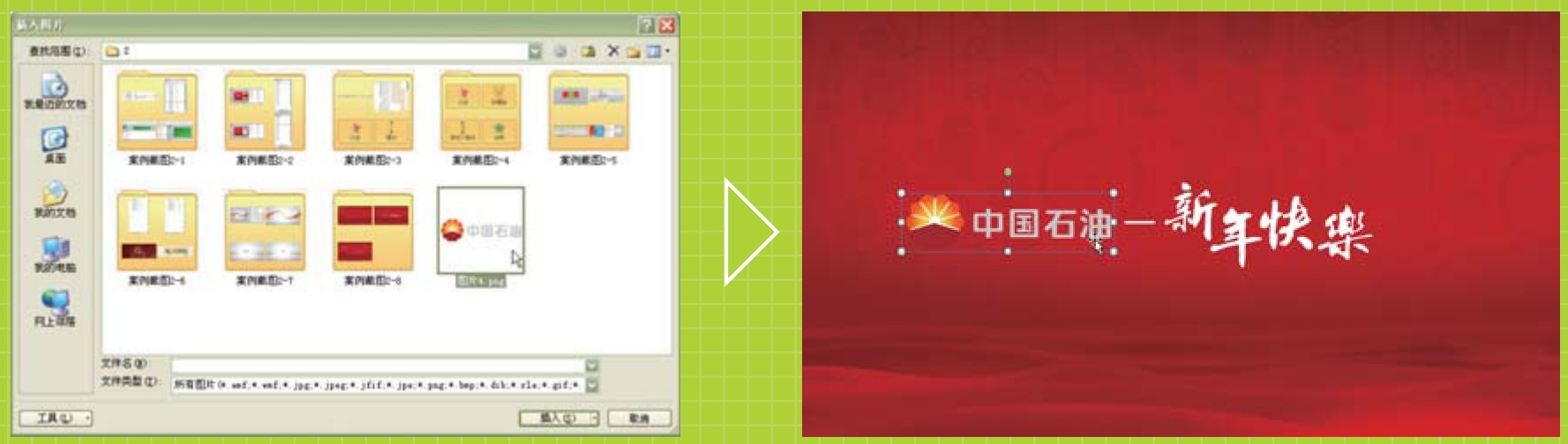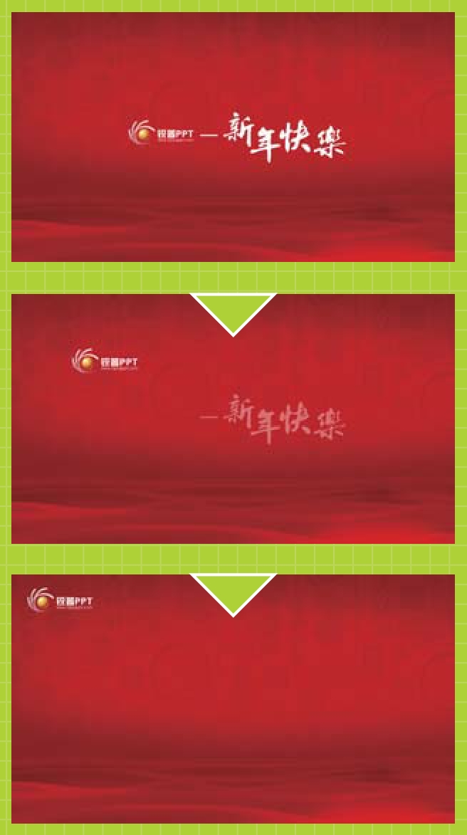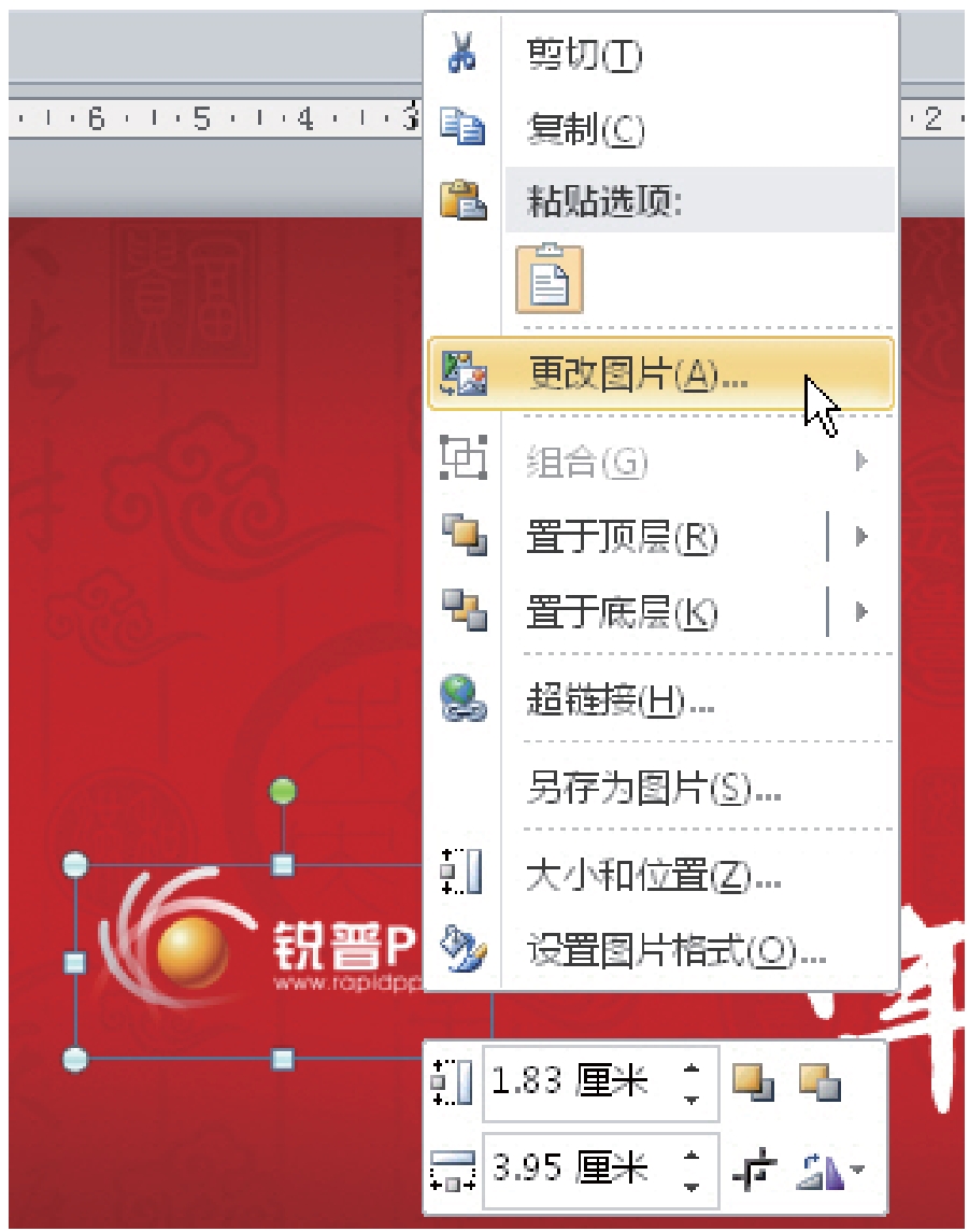 例2-8是春节PPT贺卡的开场,logo体现了祝福者的身份。如果要使用此贺卡,不需要重新制作,只要右键单击logo,选择“更改图片”命令,并用自己的png图片替换就行了,PPT里的动画、样式都不会有任何影响。