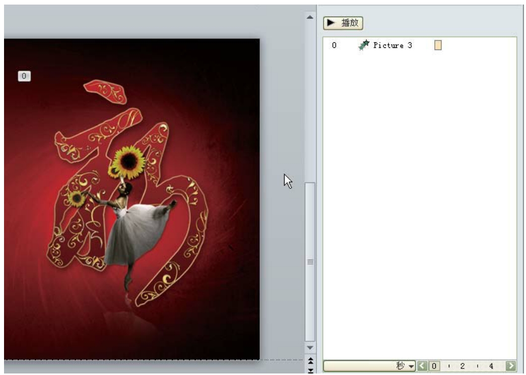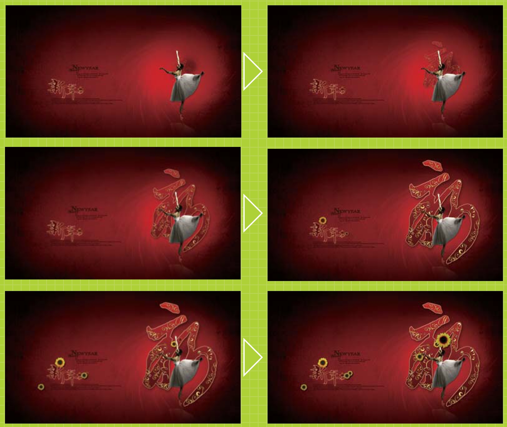 例2-6为新年贺卡性质的PPT动画单页。动画创作思路是:在舞者身后,大大的“新”字放大而出,随后,向日葵朵朵盛开。