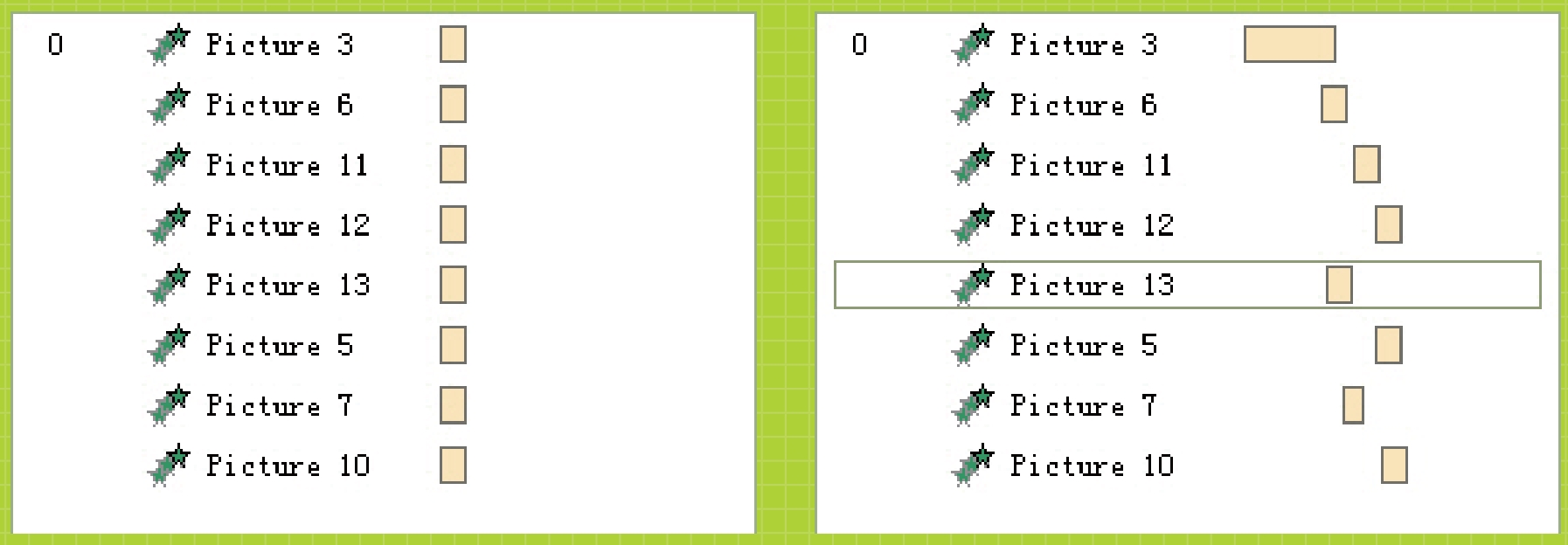Picture3为“新”字图片,因为是主动画,所以节奏稍慢,效果更明显;Picture5~Picture13为向日葵图片动画,因为是辅助动画,所以节奏快,开始时间也应调整得错落有致。