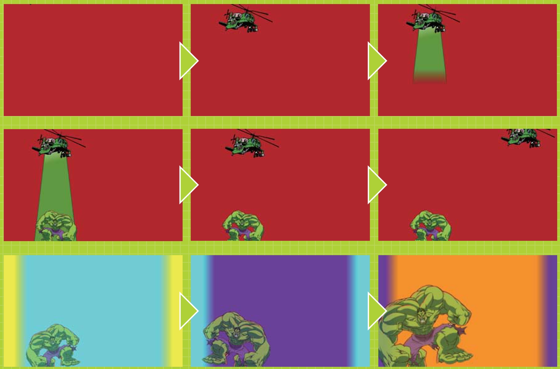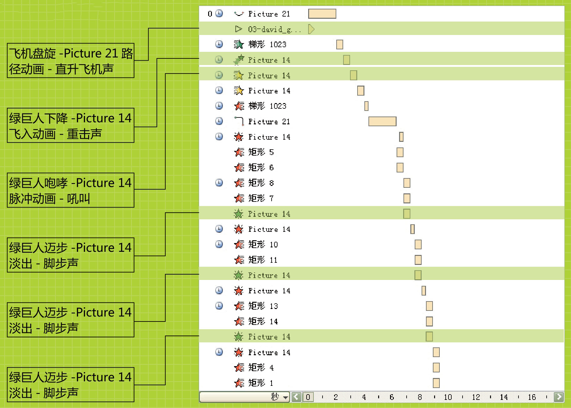 案例2-13是第三届锐普PPT大赛26号作品的片段,表现“绿巨人”从天而降的过程。除了添加紧张的背景音乐,很多动作也分别添加了声音。