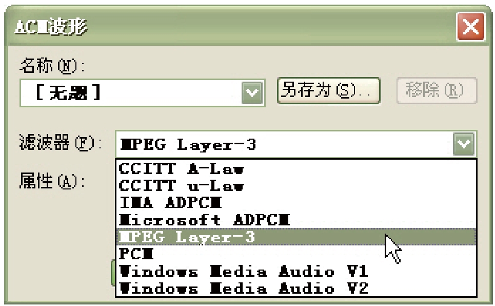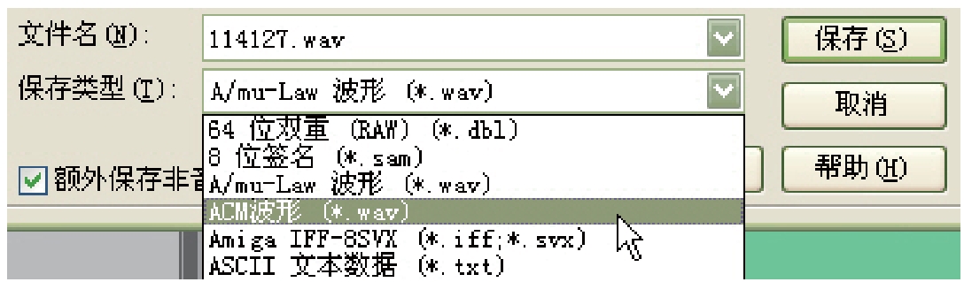 要实现声音的完美嵌入(即使在PowerPoint 2003和2007里也能正常读取),需要把wma、mp3等音乐格式转化为wav,只有后者才能实现在PowerPoint 2003和2007的完全嵌入。转换工具,推荐Adobe Audition 3.0版,打开后按以下方式另存为wav格式文件即可,所转换的wav清晰度不变,文件比mp3或wma还小。