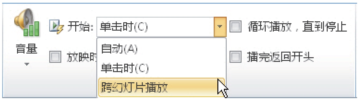 注意:要让背景音乐能够贯穿整个PPT播放,需要在“音频工具/格式”里,把开始后选项设为“跨幻灯片播放”;否则,只有音乐播放完才会切换到下一页。