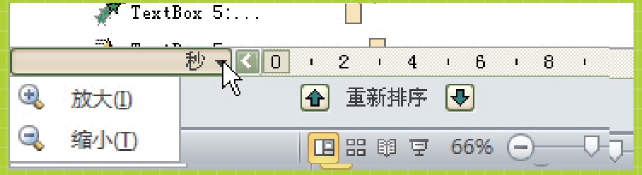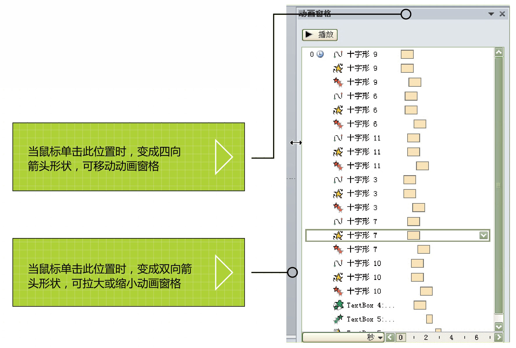 单击动画窗格底部“秒”字按钮,会出现“放大”、“缩小”的符号,单击符号,即可实现动画窗格刻度的变化,更能凸显时间轴的细节或整体。