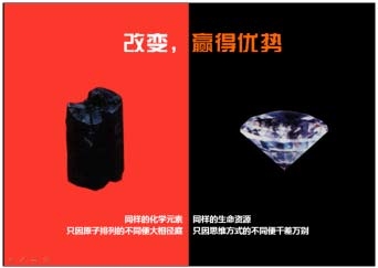用炭和金刚石结构的对比,这种人人都知道的常识,说明不同的思维方式将决定人的命运,这就容易理解而且比较有说服力。