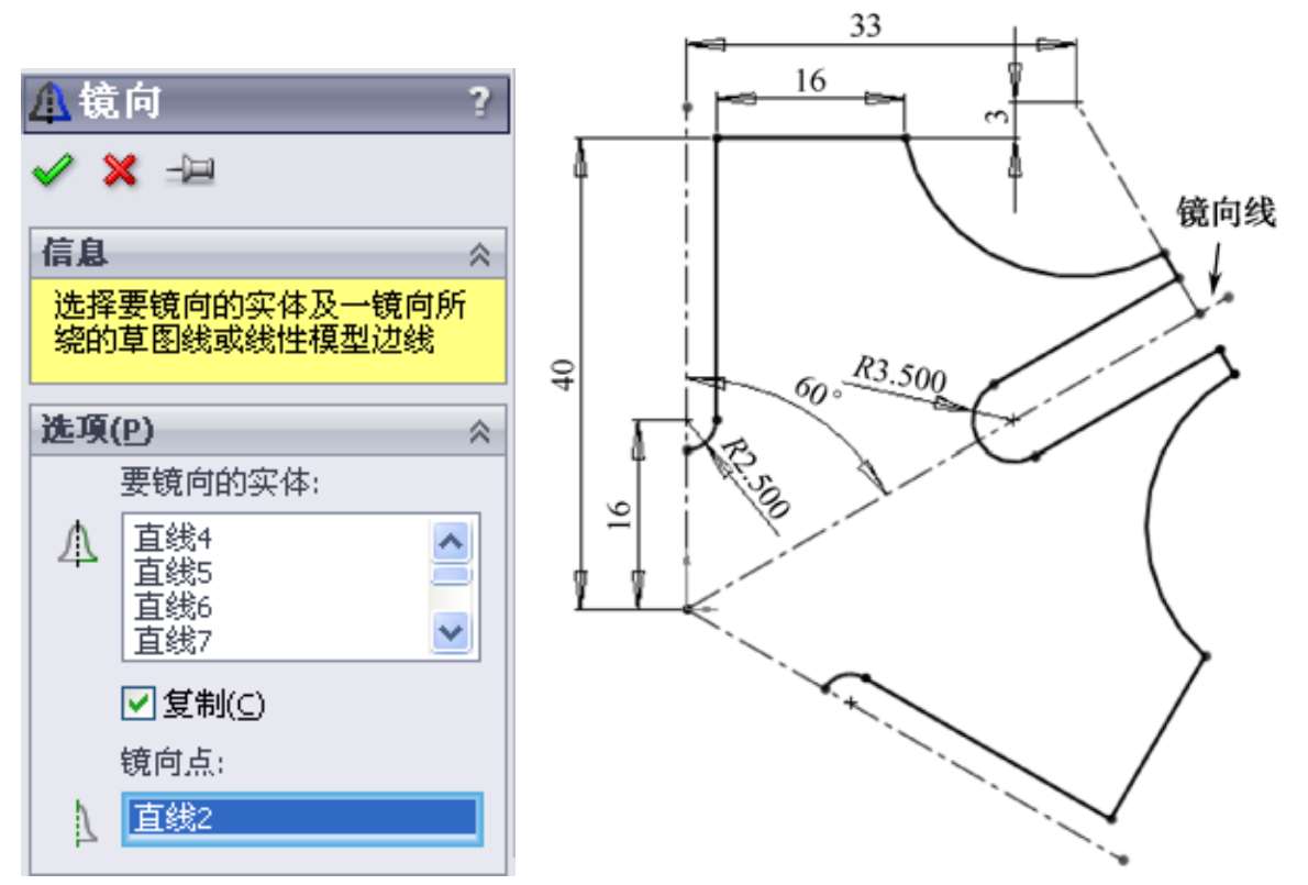 ,以交叉窗口方式(从右向左拖拉)框选草图右部,如图 2-49 所示,单击右键,选择竖直中心线,再单击右键,镜向结果如图 2-50 所示。