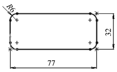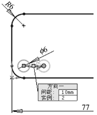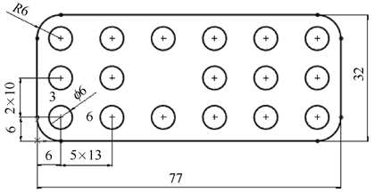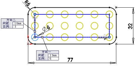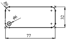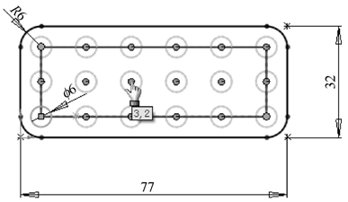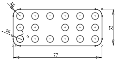 分析该平面图形可知,它是由一个 77×32 的圆角矩形和 17 个小圆组成,其中小圆成等距布局,只是中间空缺一个,因此中间小圆可用线性阵列完成。其绘制过程如下: