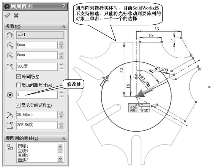 ,阵列出另外两部分,“圆周阵列”属性设置、实体选择方法如图 2-75 所示。