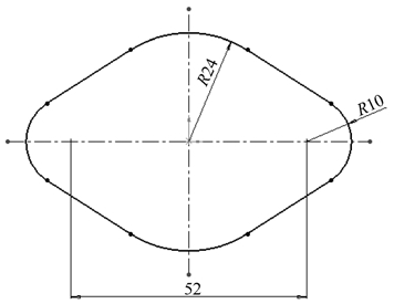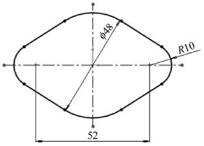 (1)分析图形。该轮廓由 4 段对称圆弧和 4 段切线组成,且上下、左右对称,所以可以先绘制出四分之一,其余部分用镜向工具绘出。