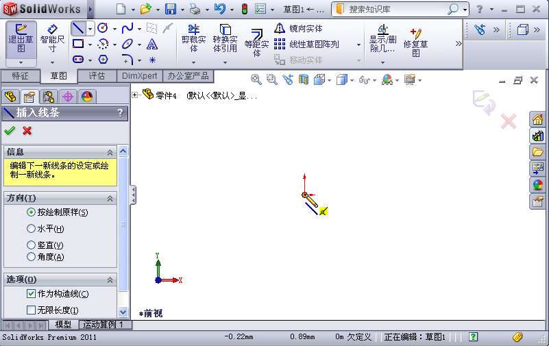 SolidWorks没有提供单独的草图绘制模块,进行草图训练时必须进入零件设计模式,然后在零件设计模式下单击“草图”标签中的“草图绘制”图标