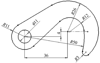分析该钩子轮廓可知,它是由一个圆、五段圆弧和两段直线组成,圆弧与圆弧间、圆弧与直线间均是相切关系;图中有两个定位尺寸 36 和 4,这样可以分析出来已知线段( φ 11、 R 11、 R 26、 R 50)、中间线段( R 12)与连接线段( R 3 和两切线)。根据平面图形的作图步骤画出各线段,然后添加几何关系,标注尺寸,完成草图绘制。其过程如下: