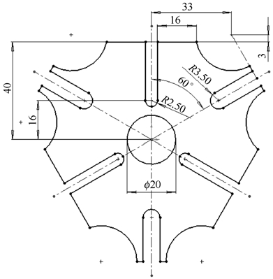 分析该外棘轮轮廓可知,它是由中间一个圆、六个U形槽、外边六个圆弧和十二段直线组成。其中六个U形槽中分两组 R 2.5 与 R 3.5(圆弧与直线间是相切关系),上面三个的圆心在同一高度。外边六个圆弧是给出了圆心,但没有给出半径,是由与之相连的直线定形。外边线段与点画线是垂直关系。六个U形槽均匀分布、外边六个圆弧和十二段直线也是均匀分布,所以绘制时,可采用圆周阵列的方法。进一步观察可看出对称关系,可用镜向方法绘制。因此,绘制时先根据平面图形的作图步骤画出点画线、圆弧、直线组成的基本图形,并添加几何关系、标注尺寸,然后镜向、阵列,最后绘制中间的圆,完成草图绘制。其过程如下: