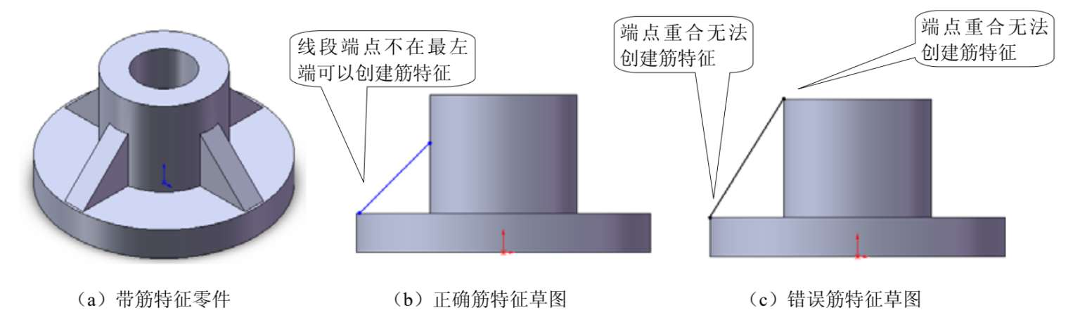 注意: 在曲面间添加筋特征时注意草图的绘制,添加指定方向必须有面能够全部接受实体,如图 3-34(b)所示,否则无法创建,如图 3-34(c)所示。