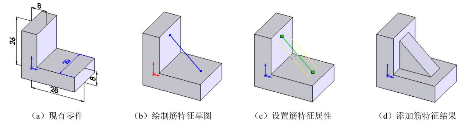 筋特征是一种特殊类型的拉伸特征,它在轮廓和现有零件之间添加指定方向和厚度的材料,是加强零件结构的增强件。添加筋特征过程如图 3-33 所示。