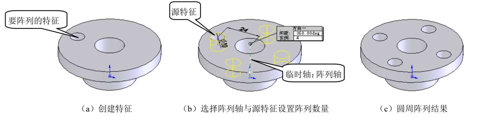 圆周阵列是源特征沿圆周的复制,其创建过程如图 3-38 所示。