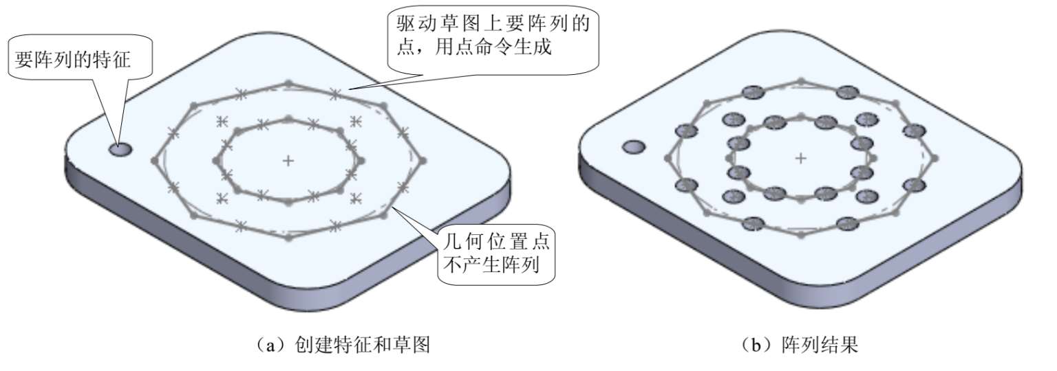 使用草图中的草图点指定特征阵列。源特征在整个阵列扩散到草图中的每个点。对于孔或其他特征,可以运用由草图驱动的阵列,其创建过程如图 3-42 所示。