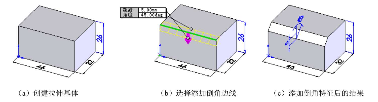 倒角是在所选的边线或顶点上生成一个倾斜面的特征造型方法。工程上应用到较一般是为了去除零件的毛边或满足装配的要求。SolidWorks系统提供了三种倒角方式:距离-距离、角度-距离、顶点。添加倒角特征的过程如图 3-32 所示。