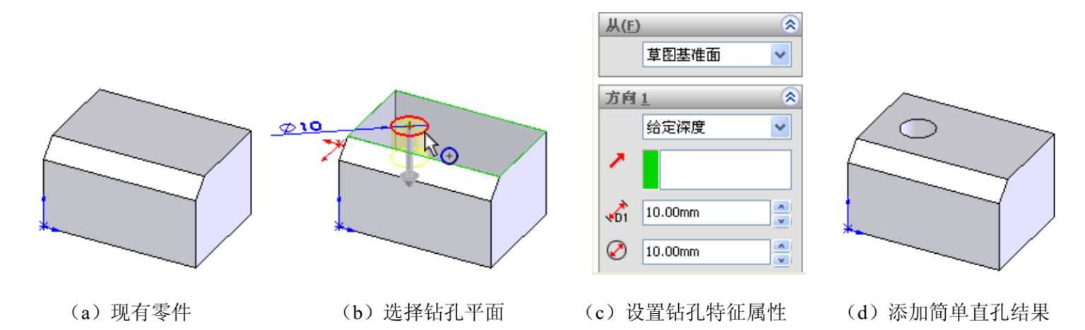 钻孔是在已有的零件实体上创建各种类型的孔特征,分为简单直孔和异型孔两种。使用“简单直孔”