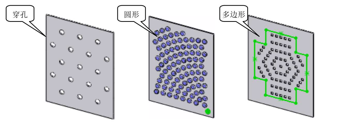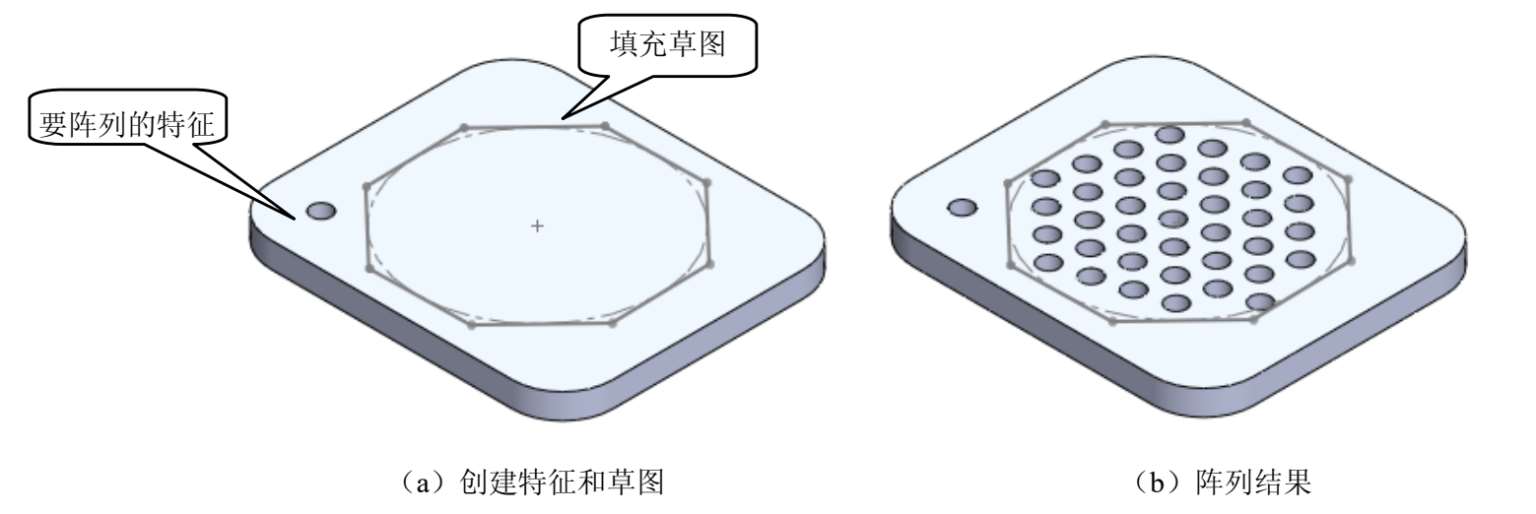 选择由共有平面的面定义的区域或位于共有平面的面上的草图进行填充阵列。如果使用草图作为边界,可能需要选择阵列方向。其创建过程如图 3-43 所示。其阵列类型有穿孔、圆周、方形和多边形,如图 3-44 所示。