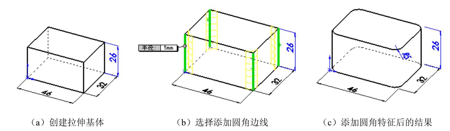 圆角可以在零件边界上生成内圆角或者外圆角。用户可以为一个面的边线、所选的多组面、所选的边线或边线环添加圆角。添加圆角特征的过程如图 3-31 所示。