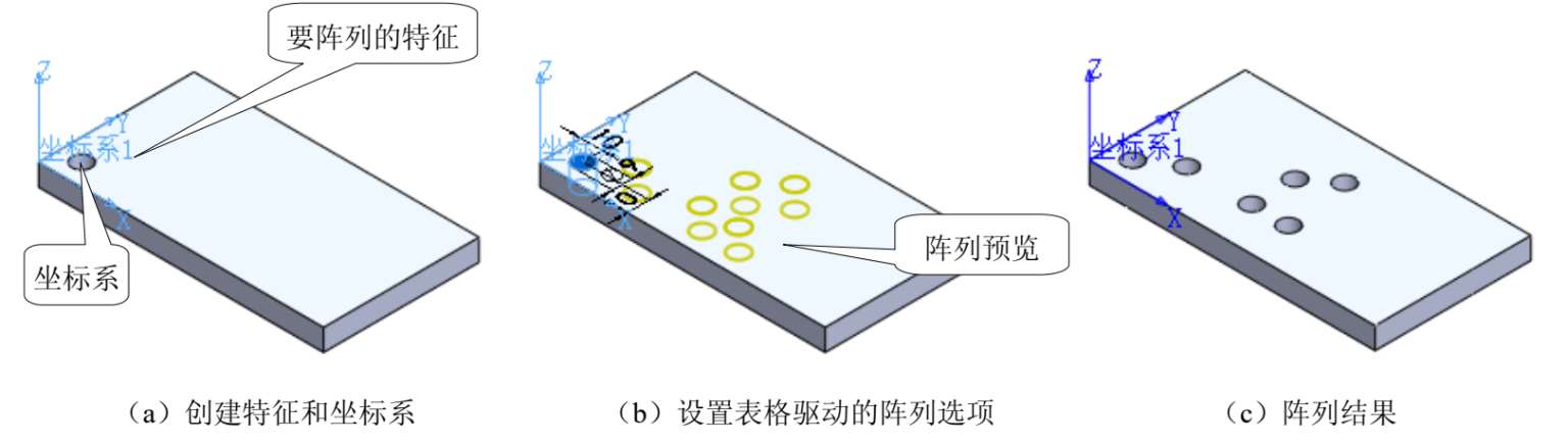 使用 X - Y 坐标指定特征阵列,其创建过程如图 3-39 所示,其表格驱动坐标值如图 3-40 所示。